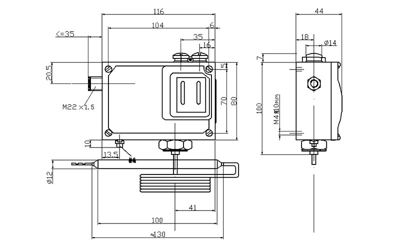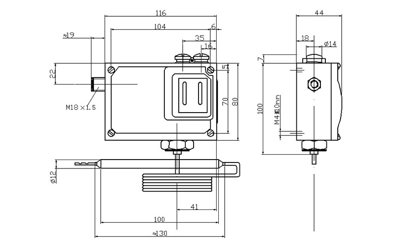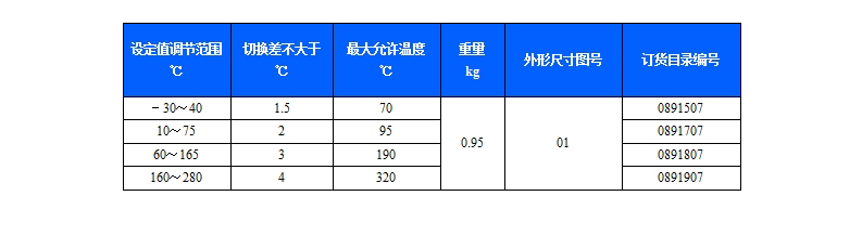 541/7TK溫度控制器采用帶毛細管溫包式傳感器,可用于流動的中性氣體和液體介質(zhì),如果介質(zhì)為腐蝕性,安裝時可選用不銹鋼溫包保護套套在銅質(zhì)溫包外(見附件)。541/7TK溫度控制器的設(shè)定值可調(diào),調(diào)節(jié)范圍-30~280℃。