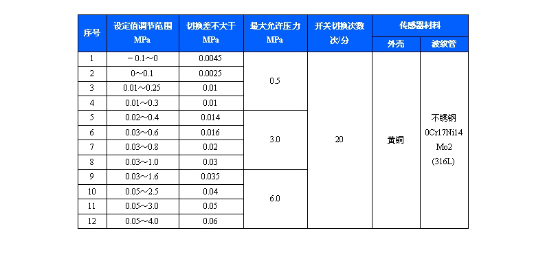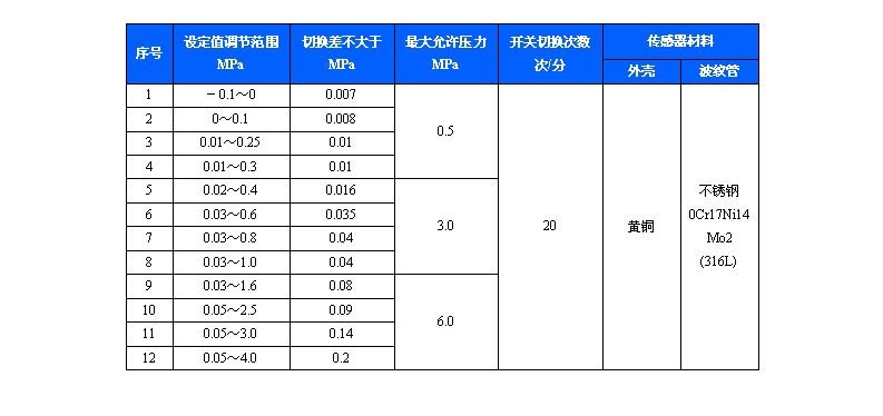 502/7D-C(小型)壓力控制器采用波紋管式傳感器,可用于空氣、氣體、水等中性氣體和潤滑油、輕燃油等液體介質(zhì)??刂破髟O(shè)定值可調(diào),調(diào)節(jié)范圍為-0.1~4MPa,502/7D-C(小型)壓力控制器均采用鑄鋁殼體,為防水型,滿足船用條件。